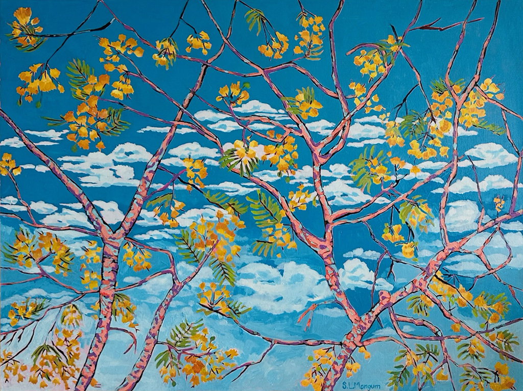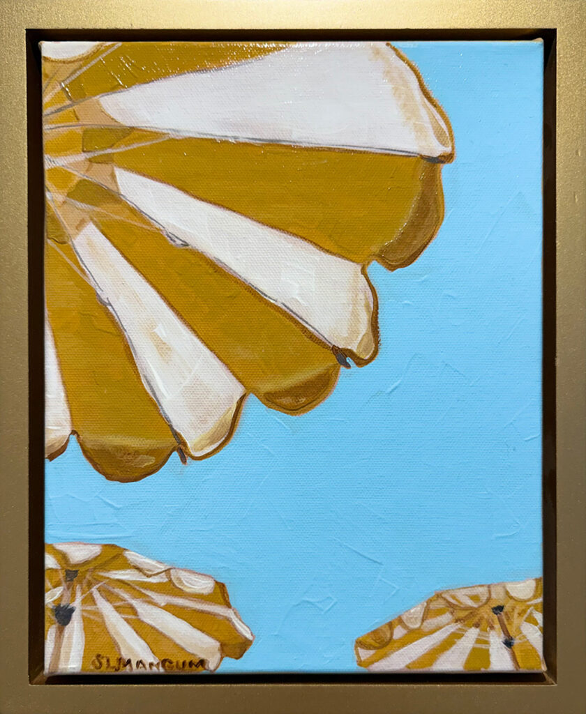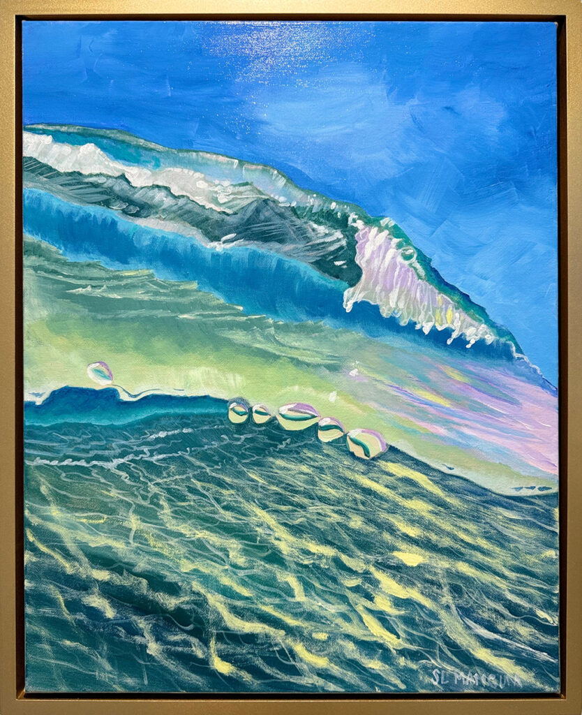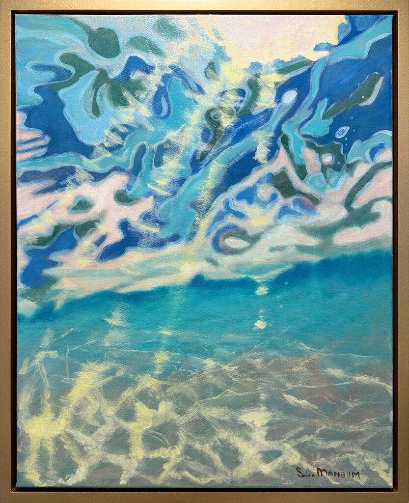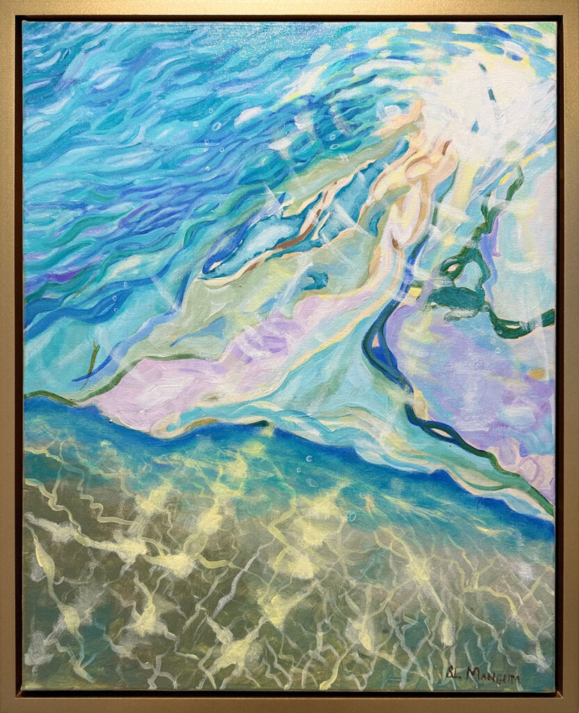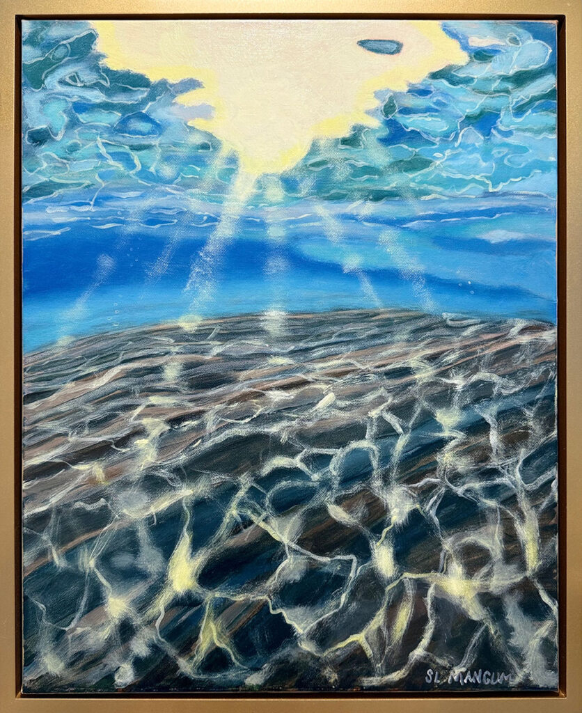 Tranquil is a series of paintings that captures the suspended moment of being underwater and looking up toward the surface. Sunlight filters through the moving water, sending soft rays downward that create shifting patterns of light and shadow across the sand below. The surface becomes both a boundary and a window, constantly changing as it refracts the world above.